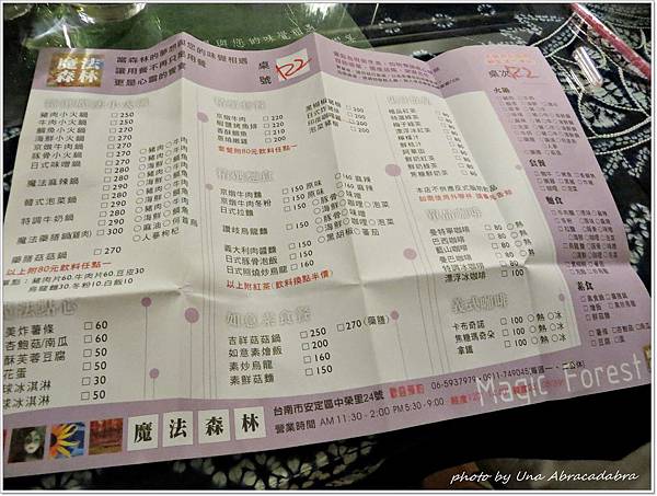 店名:魔法森林 地址:台南縣安定鄉中榮村24號 電話:06 593 7979 營業時間:週三 - 週日: 11:30 - 14:00 、 17:30 - 21:00 用餐時間:2013年七月。 推薦菜色:日式炸豬排、蔥燒嫩雞。 每人平均價位:$70-150 可否刷卡:否 有無包廂:無 有無WIFI:有 官方網頁:https://www.facebook.com/magicforest.tw ============================================================================== 好讀網誌版:http://unafang.pixnet.net/blog/post/97760595 ============================================================================== 本來的宜蘭行,因為突然來攪局的颱風一切都取消了, 於是和B先生到台南躲雨, 在B先生友人的建議下來到了這間有點魔幻的餐廳。 http://pic.pimg.tw/unafang/1374547296-2020124839_n.jpg