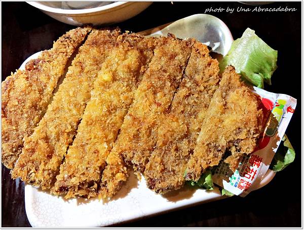 這一道炸豬排,若不是店家強力推薦,我們絕對會錯過!! 但也絕對不可以錯過!!!! 雖然豬排本身油脂量不算高,(應該是選擇的部位問題) 不過店家的處理很好,不論是麵包粉選擇、炸油的新鮮度跟油炸時間,都相當謹慎, 所以整塊豬排吃起來還是很嫩的。 p.s. 店家附了一碗豬排醬汁跟一包番茄醬, 我可以理解豬排醬汁的存在,但是拿這豬排去蘸番茄醬的人應該抓去槍斃~XD 醬汁的部分,我倒覺得完全沒有幫豬排加分(也沒有扣分就是了), 因為豬排本身太好吃了,再蘸任何東西都是多餘。 若是真要加上的話,適量的生菜絲會是最適合的。 http://pic.pimg.tw/unafang/1374547338-3736892029_n.jpg
