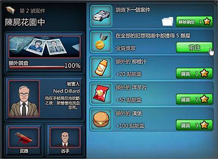 當你所有案件都調查完(包括額外調查)之後,就可以把場景多出來的星星拿去購買食物。