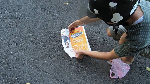 先在地上鋪上報紙,再找旁邊樹叢的樹枝把鼬獾屍體弄到報紙中,