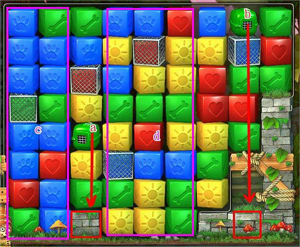這關必須把重點擺在消除(c)跟(d)這5行的積木,掉下來的寵物籃才救的下來。