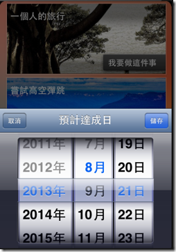 在你的 iPhone 上安裝「 Dreamsmile 」,第一次打開軟體時,會提供一些「常見的」夢想目標讓你選擇,當然你也可以添加自己的夢想里程,設定自己預計要達成的日期。