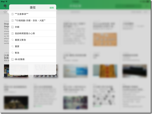 點擊畫面左上方的「星號」,就能查看加入捷徑的重要筆記清單。我自己會把常用的記事標籤(例如:用重要與緊急兩標籤搞定 Evernote 四個層次的瑣事任務),或是這一兩天即將使用的重要記事,加入這份捷徑清單中。